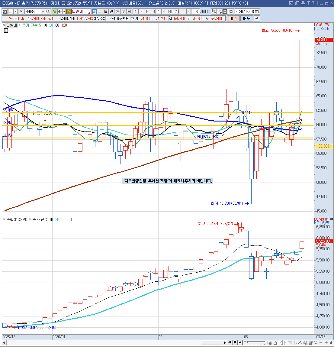 3/18 큰 양봉 발생함. 역배열중 첫 기준봉이며 시장 대비 전고점 돌파함