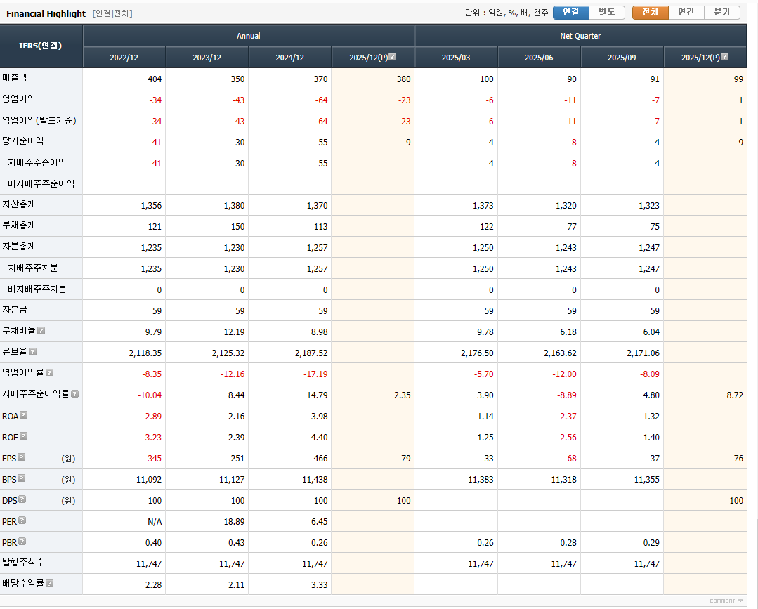 최근 3~4년간 영업실적이 좋지 않음. 영업이익률은 지속 마이너스 2자리대. 2026년 컨센서스를 봐야겠지만 크게 상승할 여력이 있지는 않을 듯.