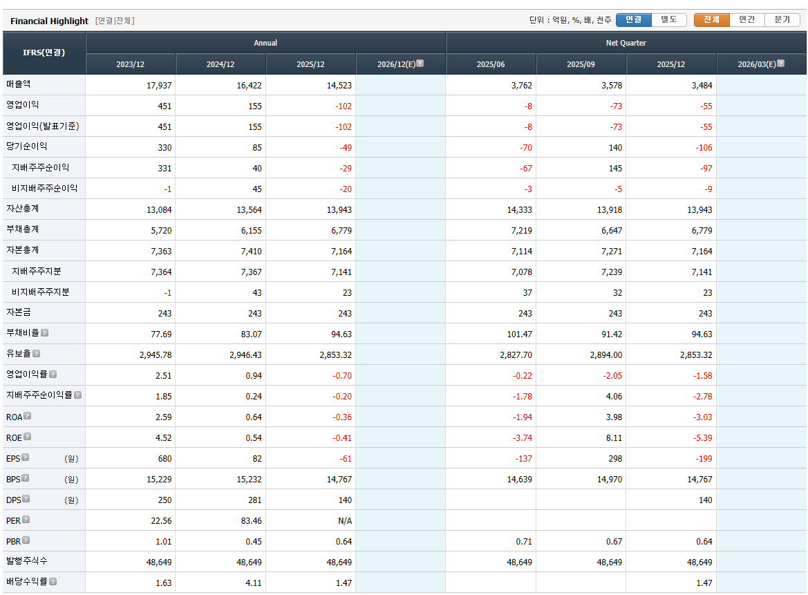 매년 매출이 눈에 띄게 줄어들고 있음. 시장 점유율이 밀리고 있거나, 주력 제품의 수요가 급감하고 있다는 신호로 해석될 수 있습니다. 2025년의 부채비율은 94.63% 아직 100% 미만이라 당장 위험한 수준은 아니지만, 매년 비율이 상승하고 있다는 점이 불안 요소입니다. 이익은 줄어드는데 빚 비중이 커지면 이자 부담이 경영을 더 압박할 수 있습니다.